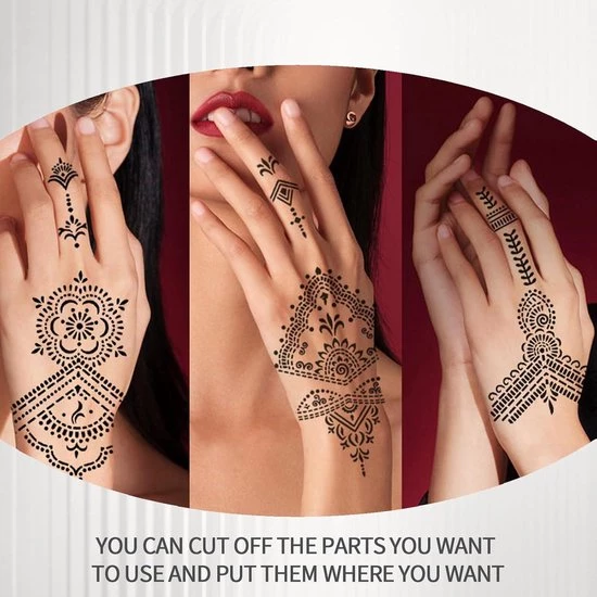 Voordelen van het product:Met deze henna tattoo stencilset kun je niet alleen artistieke ontwerpen maken, maar ook experimenteren met verschillende looks zonder blijvende gevolgen. Dankzij de hoogwaardige kwaliteit van de stencils en de diverse ontwerpen zul je zeker genieten van het plezier en de creativiteit die deze tijdelijke tattoos met zich meebrengen.
