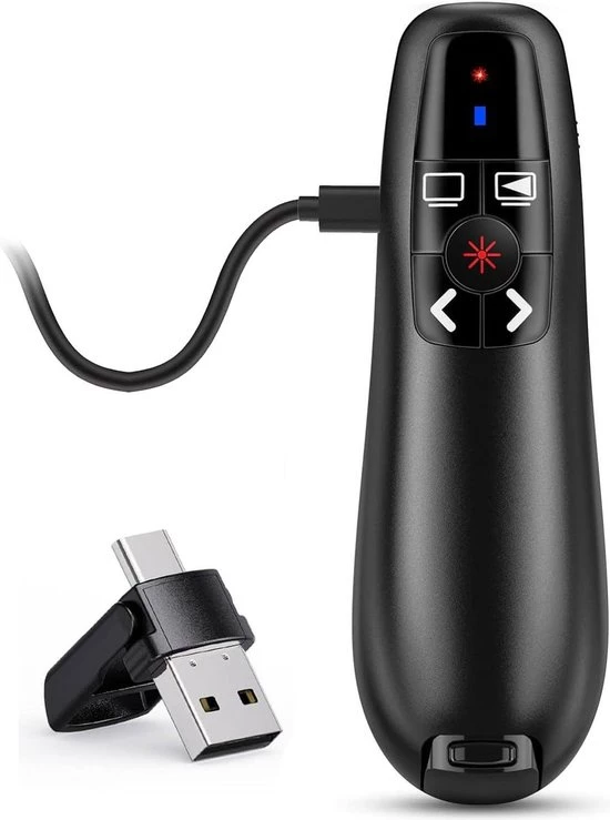 Maak uw presentaties professioneel en moeiteloos met deze 2-in-1 USB Type-C en oplaadbare presentatieafstandsbediening. Bestel nu en verbeter uw presentatievaardigheden!