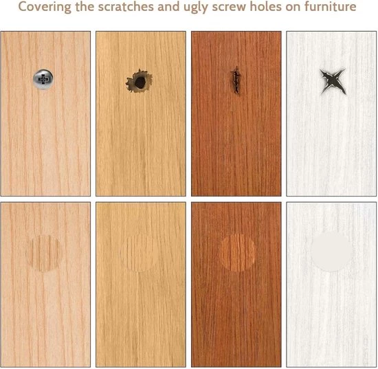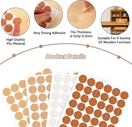 Deze stickers voor schroefgaten zijn ideaal voor het afdekken van schroefgaten, montagegaten en deuken in diverse meubelstukken. Ze zijn stof-, vocht- en roestbestendig, waardoor uw meubels langer mooi blijven.