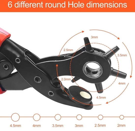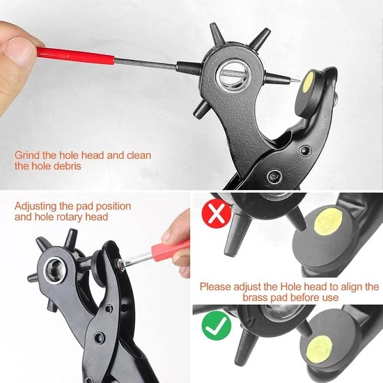 Meerdere gatmaten en complete accessoires: Deze roterende pons heeft zes maatschalen: 2-4,5 mm. U kunt precies de gewenste gaten ponsen. De set bevat ook twee vervangende messing afstandhouders, schroevendraaiers en slijpstaven. Met de slijpstaven kunt u de ponskoppen slijpen en aanslag in de gaten verwijderen. Met de schroevendraaiers kunt u de positie van de ponsplaat en de roterende ponskop aanpassen.