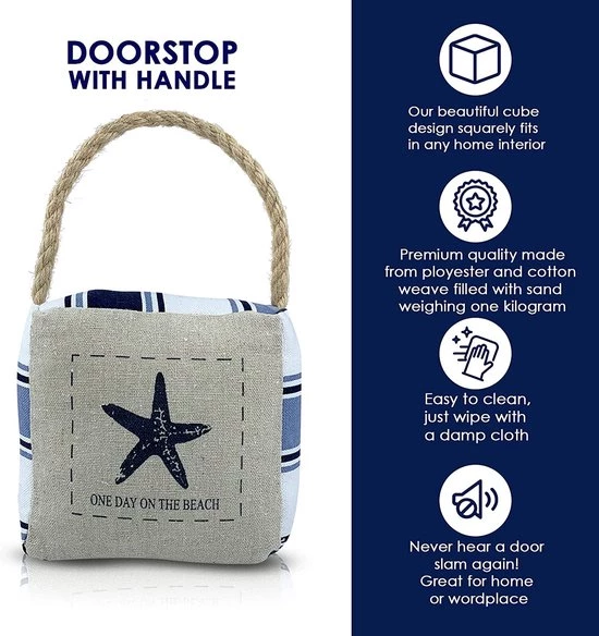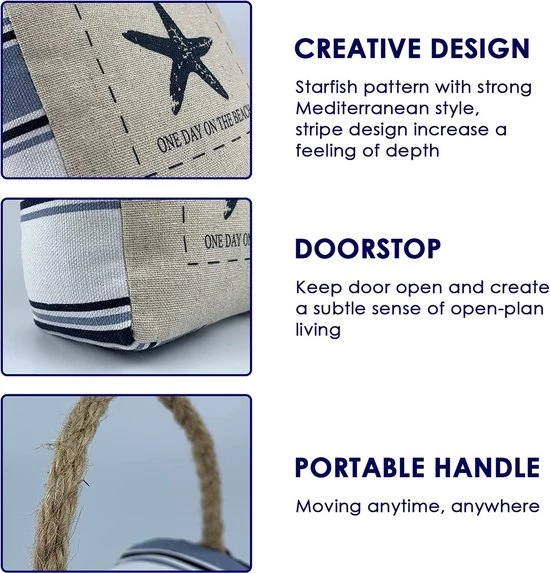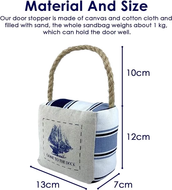 Creatief ontwerp: gepersonaliseerd zeilbootpatroon met krachtige mediterrane invloeden. Het unieke omklapbare ontwerp maakt de deurstof zeer uniek, zodat u elke dag een goed humeur behoudt. De bovenkant van de zandzak is voorzien van een draagbaar handvat, zodat u hem altijd kunt verplaatsen.