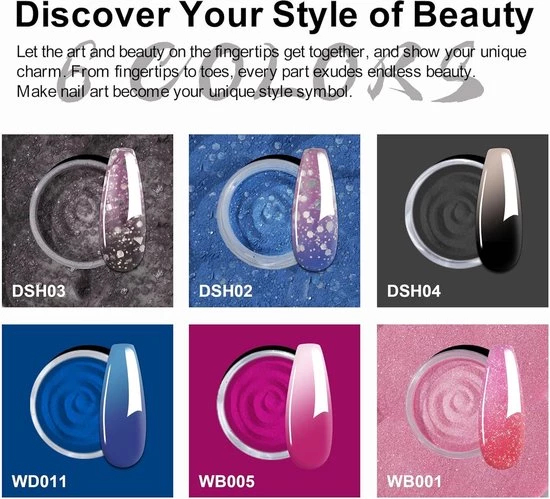 Voordelen van deze starterskit: - Het dippoeder verandert van kleur afhankelijk van de temperatuur - Veilig en duurzaam, gemaakt van natuurlijke en hoogwaardige materialen - Zorgt voor een glamoureuze look die langer dan 28 dagen aanhoudt - Prachtige kleuren die niet vervagen, krassen, breken of afbladderen - Eenvoudig te gebruiken zonder dat er UV-licht nodig is - Perfect cadeau voor vrouwen die van nail art houden