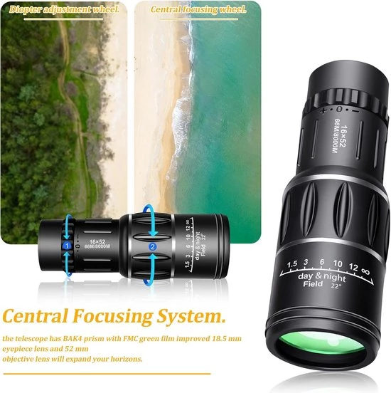Ervaar de wereld om je heen in verbluffende helderheid en detail met de krachtige 16x52 HD monoculaire telescoop. Dit compacte en draagbare instrument is ideaal voor zowel volwassenen als kinderen en biedt een breed scala aan toepassingen, van vogelspotten tot reizen en sportevenementen. Met zijn hoogwaardige optiek en compacte ontwerp is deze monoculair de perfecte metgezel voor elke buitenactiviteit.