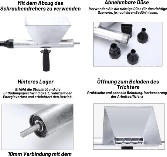 Voordelen:Het mortelpistool is voorzien van vier verwisselbare sproeiers in verschillende maten, die u naar behoefte kunt aanpassen. Hierdoor kunt u eenvoudig wisselen tussen verschillende voegbreedtes. Met dit mortelpistool kunt u elk type mortelvoeg nauwkeurig aanbrengen.