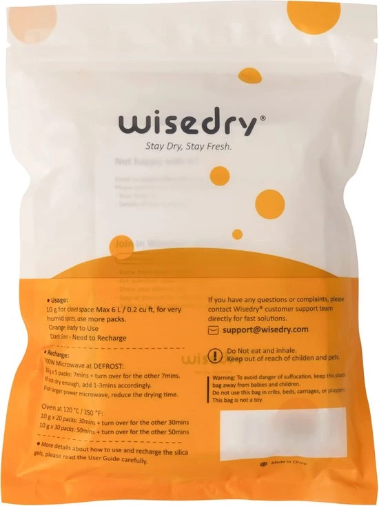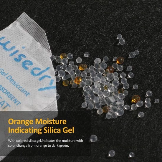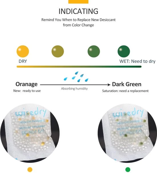 [Droogmiddel met indicator] – Deze silicagel bevat oranje korrels die gebruikers helpen snel te zien wanneer het droogmiddel vervangen moet worden. De oranje kristallen worden zwartgroen wanneer ze vol vocht zitten. [Regenereerbare silicagelzakjes] – Herbruikbaar door te verwarmen in de magnetron of oven. Magnetron: Lage temperatuur gedurende een paar minuten. Oven: Temperatuur < 110 °C. Laad de zakjes alleen op als ze niet volledig verzadigd zijn om smelten of brand te voorkomen. [Veilige dubbele verpakking en eenvoudige opslag] – 10 g x 30 stuks vacuüm verpakt en in een afgesloten aluminium ziplockzak die de zakjes beschermt voor gebruik. [Silicagel van voedingskwaliteit] – Tot 35% vochtabsorptievermogen. Kobaltchloridevrij en niet-giftig, veilig voor voedsel en medicijnen. Gebruik deze oranje silicagel in plaats van blauwe. [Tevredenheidsgarantie] – Als u niet tevreden bent, neem dan contact met ons op voor een snelle oplossing.