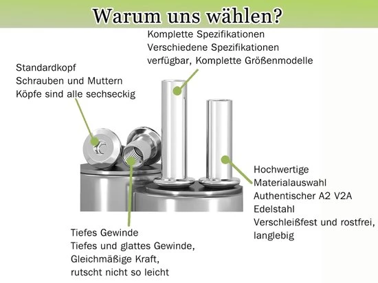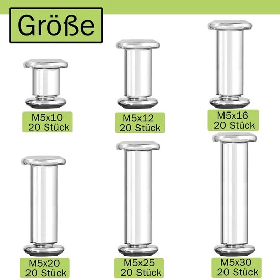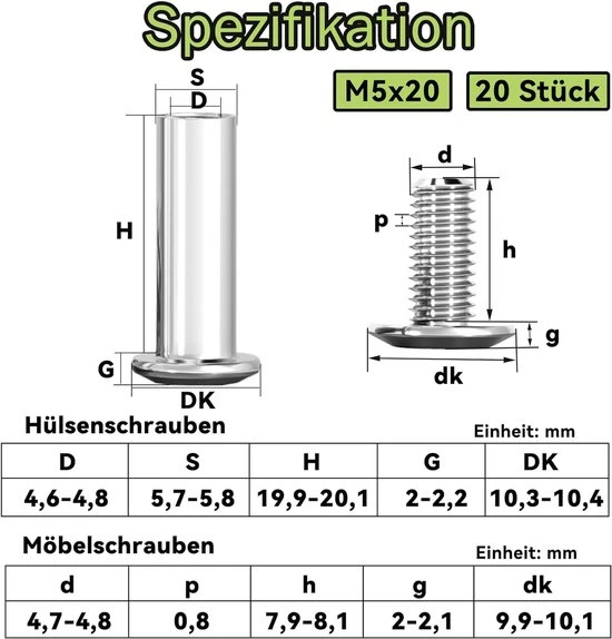 Deze verbindingsschroeven zijn ideaal voor het veilig en permanent bevestigen van houten planken en meubels. Met een afmeting van M5 x 20 mm zijn deze hulsschroeven perfect voor het verbinden van kasten en andere meubelstukken. Gemaakt van hoogwaardig roestvrij staal (A2 V2A), zijn ze corrosiebestendig en daardoor geschikt voor zowel binnen- als buitengebruik.