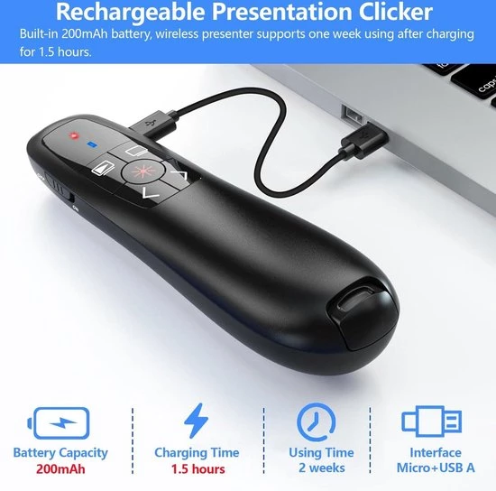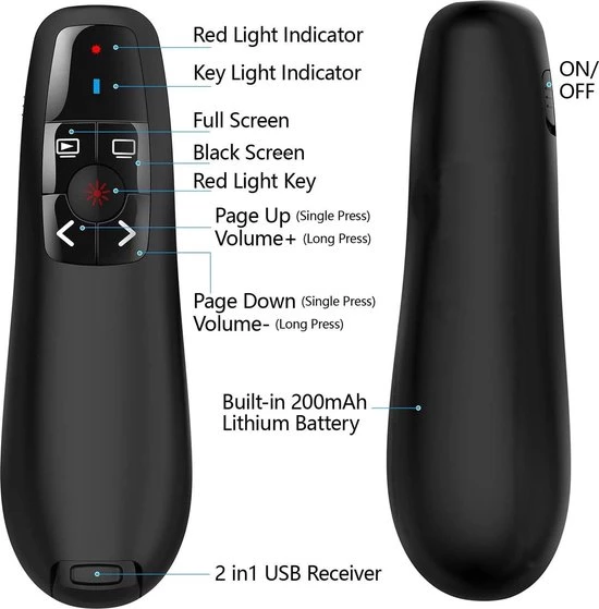 Deze draadloze PowerPoint-afstandsbediening heeft een bereik van 50 meter en een groot bereik van 200 meter. De PowerPoint-presentatieklikker kan de belangrijkste onderdelen markeren en aanwijzen met een helder rood licht, dat goed zichtbaar is tegen de meeste achtergronden (niet aanbevolen voor tv-/led-/lcd-schermen). Met deze computerklikker kunt u door de ruimte lopen en nauwer met uw publiek communiceren.