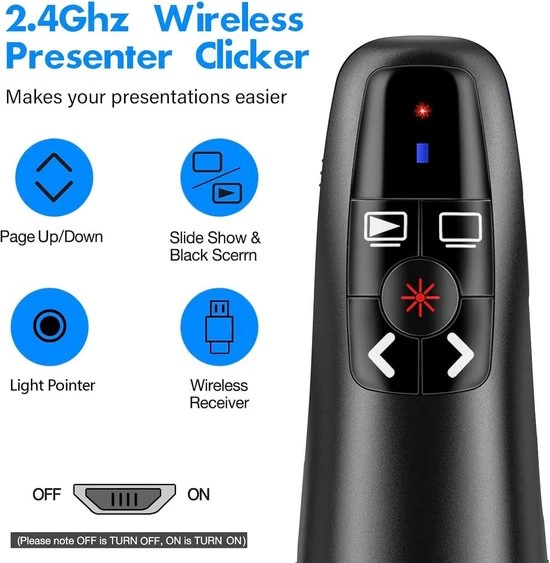 Deze draadloze clicker is de perfecte partner voor uw presentaties, lessen, coaching, toespraken, vergaderingen of conferenties. Met een intuïtieve presentatieaanwijzer, een lange gebruiksduur, een helder rood licht en universele compatibiliteit maakt deze afstandsbediening het geven van presentaties een moeiteloze en professionele ervaring.