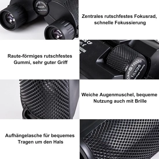 Deze verrekijker met een vergroting van 10x en een lens van 25 mm is ideaal voor wie op zoek is naar een gedetailleerde en boeiende observatie-ervaring. Met een groot gezichtsveld van 114 m/1000 m kunt u genieten van schitterende details op een afstand van 1000 meter.