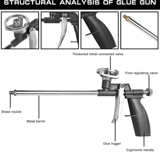 Het schuimpistool is goed ontworpen en gebruiksvriendelijk. Het injectievolume kan nauwkeurig worden geregeld via het draaiventiel en de injectiehoek kan eenvoudig worden aangepast voor een precieze injectie. Het pistool stopt direct wanneer de trekker wordt losgelaten. Dankzij het lichte gewicht is het prettig om het gedurende langere tijd te gebruiken. Het kan eenvoudig worden gereinigd met een pistoolreiniger.