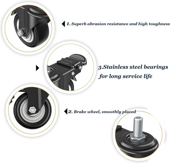 Hoogwaardig materiaal: wielen met remmen. Het wieloppervlak is gemaakt van hoogwaardig rubber, met geluidsarme dubbele lagers en een zeer sterke schroef, duurzaam en bestand tegen een gewicht tot 100 kg, wat een lange levensduur garandeert.