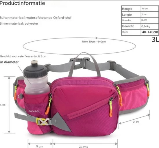 Compact en ruim ontwerp: Met een formaat van 22 x 16 x 8 cm en een inhoud van ongeveer 3 liter biedt deze heuptas voldoende ruimte voor dagelijkse benodigdheden zoals een zonnebril, handschoenen, mini-paraplu of portemonnee.