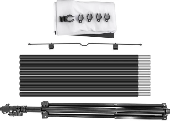 Dit scherm is moeiteloos en zonder gereedschap in slechts enkele stappen op te zetten. De spanstangen vereenvoudigen de montage van het frame, terwijl de bovenklemmen het scherm stevig op zijn plaats houden.