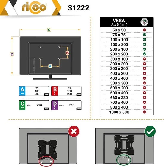 Voordelen:Deze tv-beugel wordt geleverd met voorgemonteerde onderdelen, pluggen voor betonnen muren, schroeven voor de montage van het scherm, muurschroeven en alle benodigde accessoires. Het is een veelzijdige en duurzame oplossing voor het ophangen van uw televisie.