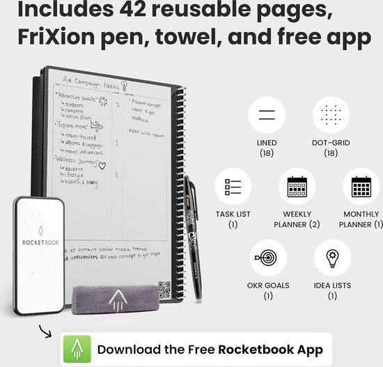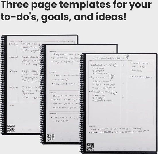 Dit herbruikbare Smart Notebook is de ideale oplossing voor iedereen die op zoek is naar een duurzaam en praktisch notitieboek. Met 42 herbruikbare pagina's en 7 verschillende paginasjablonen is het perfect voor planning, lijstjes, doelen, aantekeningen maken, schetsen en het delen van ideeën.