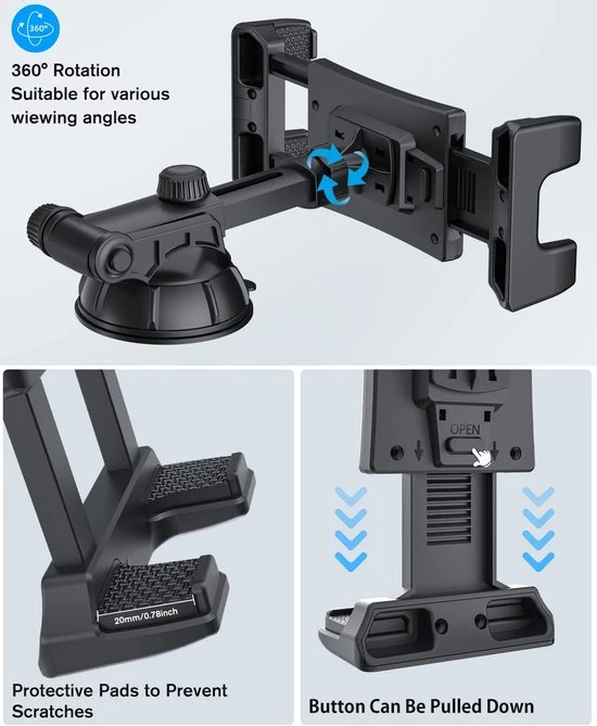 Stevige bevestiging: Om de tablethouder voor in de auto stabiel te houden, heeft deze zuignap een zeer stevige bevestiging. Zo blijft uw tablet stabiel tijdens het rijden, zonder dat u bang hoeft te zijn dat u hem laat vallen. Wat u echter moet weten voordat u koopt, is dat het veel moeite kost om de houder te verwijderen als u hem wilt verwijderen.