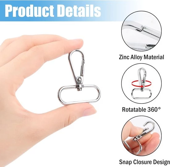 Deze set van 20 karabijnhaken van 38 mm biedt een ideale oplossing voor al je doe-het-zelfprojecten, knutselprojecten en tasaccessoires. Dankzij de 360° draaibare verbinding bevestig je deze karabijnhaken eenvoudig aan tassen, riemen of lanyards, waardoor ze perfect zijn voor zowel creatieve als praktische toepassingen.