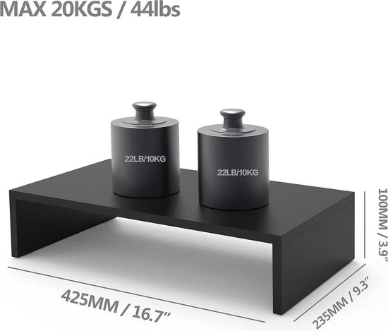 Voordelen:Deze monitorstandaard is gemaakt van hoogwaardig MDF en is krasbestendig. Met een maximale belastbaarheid van 15 kg is hij geschikt voor de meeste monitoren en laptops. Het ergonomische ontwerp, met een hoogte van 100 mm, zorgt voor een comfortabele kijkpositie en helpt fysieke belasting te voorkomen.