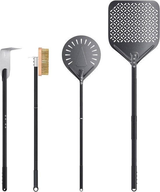 Deze complete pizza-accessoireset bevat alles wat je nodig hebt om je zelfgemaakte pizza's te perfectioneren. De set bevat een rechthoekige, geperforeerde pizzaschep van 30 x 35 cm, perfect om je pizza veilig in en uit de oven te plaatsen, en een ronde pizzaschep van 23 cm om de pizza tijdens het bakken om te draaien en te hanteren. Er is ook een verstelbare roestvrijstalen borstel van 15 cm met zachte messing haren voor grondige reiniging van je oven, en een spindelhoek voor het eenvoudig verwijderen van vuil. Deze accessoires zijn gemaakt van hoogwaardig aluminium en zijn hitte- en roestbestendig, waardoor ze ideaal zijn voor zowel binnen- als buitengebruik. Elk onderdeel is ontworpen voor gebruiksgemak, met een lichtgewicht constructie en een ergonomische handgreep voor eenvoudige bediening en opberging.