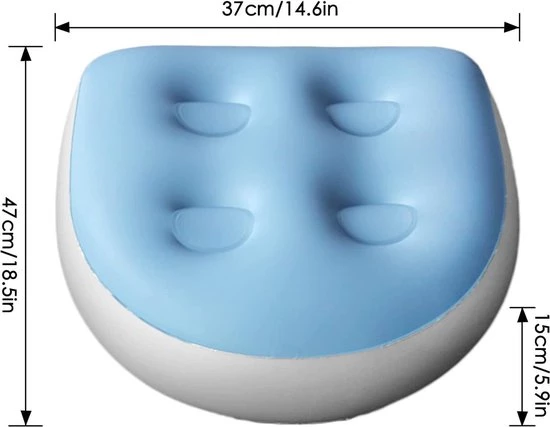 De afmetingen van het kussen zijn 18,5 x 14,6 x 5,9 cm, waardoor het geschikt is voor de meeste badkuipen en badkuipen. De zuignappen aan de onderkant zorgen ervoor dat het kussen goed blijft liggen en niet gaat drijven of verschuiven.
