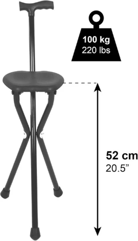 Stevig en draagbaar : Dankzij de stevige aluminium constructie kan deze wandelstok tot 100 kg dragen. De totale hoogte is 87 cm en de hoogte tot aan de zitting is 52 cm.