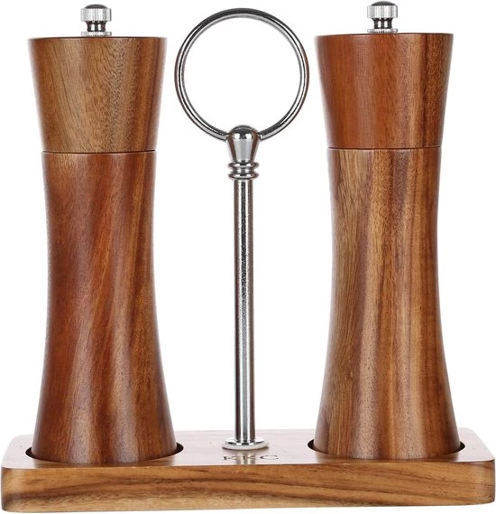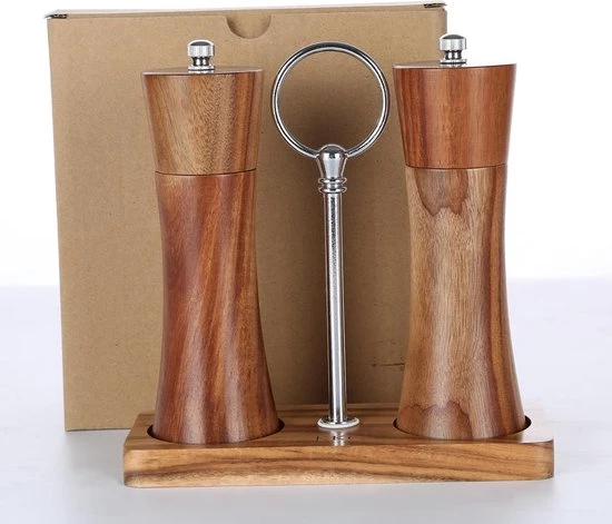 KKC Zout- en pepermolen, handmatige houten verstelbare keramische molen, kruidenmolen voor grof zout, acaciahouten zoutmolen, pepermolens, keukenpeper, chilimolens, molenset met schaal 15 cm